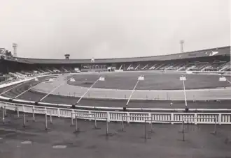 The first greyhounds moved into the kennels on 20 May and the first private trial was planned for 30 May with racing starting on 1 June but delays ensued.[4][5] The first meeting finally took place on Monday 20 June 1927 with the first race won by a greyhound called Charlie Cranston. Entry Badge, the 1927 English Greyhound Derby winner, also ran on the opening night. There was a capacity of 93,000 and club house accommodation for 1,000 people more than the original seating capacity in 1908.[6]