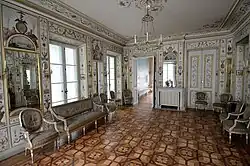 The building has a perfectly symmetrical design—each side featured five identical window-doors on the ground floor and five windows on the upper floor.[1] The building has thick brick walls, is built on a square plan, and is topped with a wooden balustrade on the roof and a squat belvedere at the summit.[1] In front of the White House, a statue of a satyr, created by Étienne Maurice Falconet, was placed.[1] The satyr carried a sundial plate crafted in 1777 by Józef Hegel.[1] The interiors were designed by Jan Bogumił Plersch and Jan Ścisło, with dominant Oriental motifs, particularly Chinese landscapes and decorative wallpapers.[1]