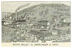 In 1865, Christian Dorflinger, a French-speaking Alsatian immigrant, opened a glass factory in White Mills. Dorflinger had arrived in the United States in 1846 and established a prosperous glass company based in Brooklyn in 1852, but decided to build a dedicated factory and company town for the Dorflinger Glass Company at White Mills, in order to escape the pollution and violence of New York at the time. At White Mills, Dorflinger and his sons built a sprawling factory complex and more than one hundred houses for workers and their families.[11]