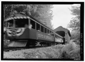 The railroad includes a 1904 Howe truss covered bridge that was originally located in East Montpelier, Vermont, where it spanned the Winooski River and carried trains for the Montpelier and Barre Railroad.[6] The bridge was purchased by the owners of Clark's Trading Post and dismantled in 1964,[7] then moved and reassembled to span the Pemigewasset River near the Trading Post.[8] During one weekend in September, Railroad Days are celebrated, with extra trains and special consists. That yearly event had stopped in 2014 and now operates every 5–10 years.