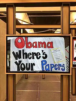 An example of birtherism, a movement to question President Obama's American citizenship and legitimacy[18]