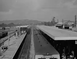 From 1957 the station was rebuilt. On the up side it had a ticket hall, waiting room with refreshments, ladies waiting room, toilets, stationmaster's office, district inspector's office, parcels office, central heating, and a 320 ft (98 m) steel and aluminium platform canopy. On the down side it had a 270 ft (82 m) canopy, refreshment room and toilets.[2]