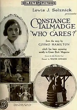 Who Cares? is a lost[1] 1919 American silent film comedy starring Constance Talmadge and Harrison Ford. The director was Walter Edwards who usually worked with Marguerite Clark. Julia Crawford Ivers wrote the scenario based on the 1919 Cosmo Hamilton novel, and her son James Van Trees was the film's cinematographer.[2][3]