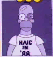 A mug shot of a battered and bruised Homer Simpson is shown, in which he is wearing a T-shirt with the campaign slogan "Haig in '88" on it, a reference to Alexander Haig's unsuccessful run for the 1988 Republican Party presidential nomination.