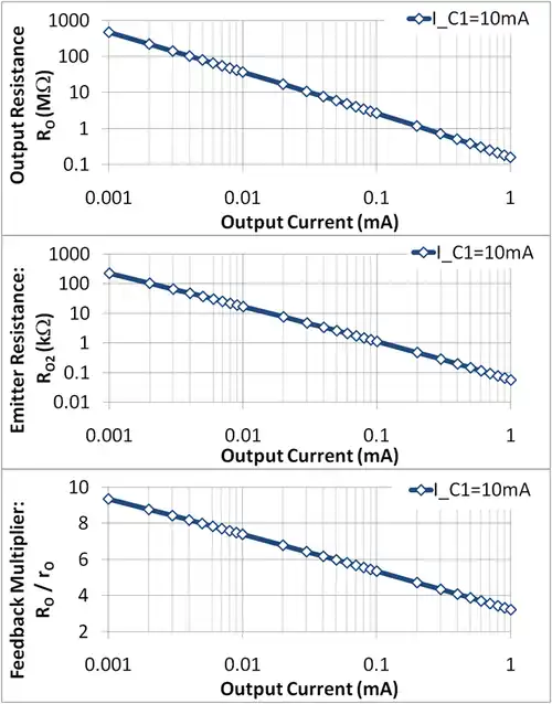 Bottom panel: Feedback factor contributing to output resistance. Current in the reference transistor Q1 is held constant, thereby fixing the compliance voltage. Plots assume IC1 = 10 mA, VA = 50 V, VCC = 5 V, IS = 10 fA, β1, = 100 independently of current.