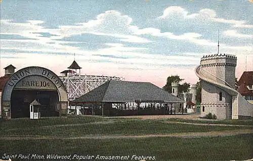 Once called the "Coney Island of St. Paul,"[7] the Wildwood Park featured numerous attractions. In addition to the popular picnic grounds and amusement rides, there were traveling shows, diving ponies, and hot air balloon rides. A bathhouse operated just west of the rides, and had a water chute and springboards. Athletic types would play baseball at the water’s edge on the beach.[5] Additional activities included orchestral concerts, free dancing lessons, boating, bowling, a carousel, fishing, a penny arcade, a shooting gallery, playgrounds, a postal photo gallery, swings, ball-throwing games, and a twenty-five cent motorboat trip around White Bear Lake.[8]