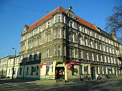- Tenement at 15 Wojska Polskiego Street (corner of Wileńska Street) – a four-story eclectic building with Baroque Revival elements. The architectural details have been preserved.[14] The ground floor is bossaged, and the upper stories are plastered. The corner features a three-story bay window.[9][14] The window pediments are semicircular and segmented.[14] The window sills and gable decorations feature geometric and floral motifs.[9][14] The façade is richly adorned with decorations of geometric, floral, shell, and pilaster motifs. The entrance portal is decorated with pilasters, a triangular pediment, and laurel wreaths, ribbons, garlands, and a cartouche.[9] A two-story annex is located on the Wileńska Street side.[14]