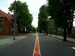 The street is lit with lamps located on one (north-western) side. The asphalt road has a width of between 7.4 and 8 meters, with 2 meters allocated to a bike path created after renovations in 2013.[12] Trees line both sides of the street, and sidewalks made of pavement slabs are also present on both sides. The intersections and roundabout are devoid of traffic lights. There are six pedestrian crossings: at the intersection with Lwowska and Warszawska streets, two at the roundabout with Ogrodowa Street, in front of the southern entrance to the School of Construction and Crafts, between the northern entrance to the school grounds and the intersection with Kiliński Street, and the last one at the intersection with Wojska Polskiego and Browarna streets.[11]
