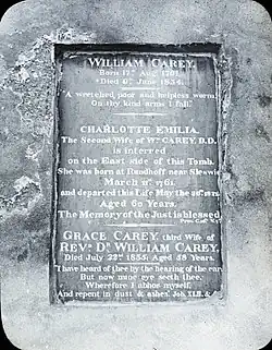- ^ "William Carey's Historical Wall – Carey Road, Pury End, Northamptonshire, UK". UK Historical Markers. Waymarking.com. Retrieved 9 July 2016. Includes image of memorial stone