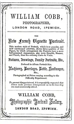- ^ Gobbitt, David (16 April 2024). "Advertisement of Ipswich photographer W. Cobb, 1862". Flikr. David Gobbitt. Retrieved 24 April 2024.