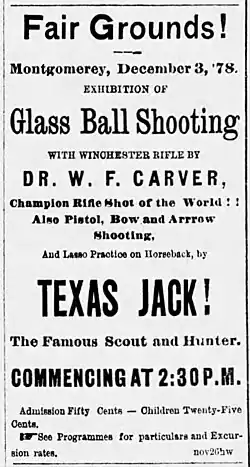 Carver migrated to California in 1876, where he honed his shooting skills. At about this time he coined the moniker "Evil Spirit", accompanied by a "camp-fire tale" that the name had been given to him by Spotted Tail, the famous chief of the Brulé Lakota, because Carver had felled a rare white buffalo.[4] In December 1877 the Evil Spirit issued a challenge to all comers; he would use a rifle and the challenger could use a shotgun, and the targets would be glass balls thrown from the newly invented Bogardus glass ball trap. He also contended that he could hit more targets from horseback than a challenger could hit while standing on the ground. One of the first significant awards Carver won was for breaking 885 glass balls out of 1000 in San Francisco on February 22, 1878. The gold badge was capped with the image of a grizzly bear and bore an inscription that proclaimed Dr. W. F. Carver the "Champion Rifle Shot of the World". Following his success in California, Carver recruited Texas Jack Omohundro, and the pair went on tour giving exhibitions of shooting prowess, with Carver demonstrating his expertise with the rifle while Omohundro displayed his proficiency with the pistol. These demonstrations included endurance contests as well as target competitions.[4] An article in The New York Times on July 6, 1878, illustrates the reception Carver received: