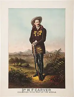 It was a common practice during the late 19th century for well-heeled men, from the East and from abroad, to travel to the West to engage in hunting expeditions, and Carver undoubtedly had the opportunity to participate in several of these hunts. Buffalo Bill Cody wrote in his 1879 autobiography that Carver, who, in Cody's words, "has recently acquired considerable notoriety as a rifle-shot," had joined a hunt at which Cody had been engaged as a guide by the Englishman Thomas P. Medley.[11] Late in 1874 Carver spent two weeks practicing dentistry at Fort Sidney, after which he moved to Cheyenne, Wyoming, where he continued working as a dentist.[2]
