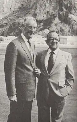 Sir William Jackson (left) with Sir Joshua Hassan, Chief Minister of Gibraltar (right), awaiting the arrival in Gibraltar of Charles, Prince of Wales in 1977.