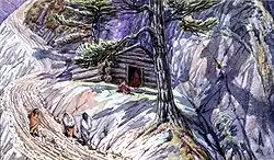 In the late 1850s, he returned to England, where he may have seen the work of the Pre-Raphaelite Brotherhood and it seems to have influenced his work. In 1861, having returned to Canada, he joined his brother's expedition to the Moisie River, a tributary of the St. Lawrence. He produced more than 100 sketches on the journey, including his impressions of the landscape and the local First Nations people, the Naskapi and Montagnais.[1] Some were used as woodcut illustrations in Henry's published report, Explorations in the interior of the Labrador peninsula (1863). After the expedition's return to Toronto, William used others as a basis for painting an important series of large finished water colours; 16 of these were made into coloured lithographs for inclusion in the same report.[2]