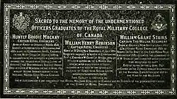 pre WWI memorial plaque dedicated to Royal Military College of Canada ex-cadets William Grant Stairs, Huntly Brodie Mackay, and William Henry Robinson