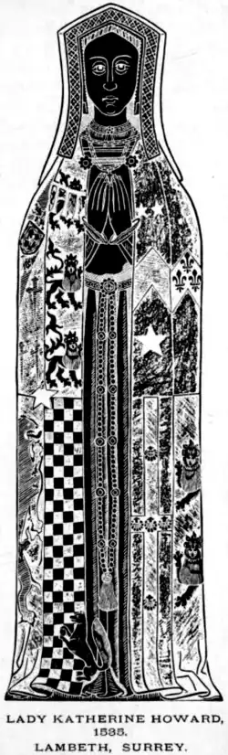 30. ^ A Who’s Who of Tudor Women: Brooke-Bu, compiled by Kathy Lynn Emerson to update and correct Wives and Daughters: The Women of Sixteenth-Century England (1984) Archived 20 October 2013 at the Wayback Machine Retrieved 1 June 2013. Katherine's death date is confirmed by a memorial brass in St. Mary's Church, Lambeth, now destroyed, but recorded by John Aubrey in his Natural History and Antiquities of the County of Surrey, vol. V (London, 1719), p, 231-2.