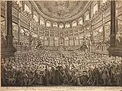 Engraving by Thomas Worlidge of the Sheldonian Theatre on the occasion of the 1759 installation of the Chancellor of Oxford University.
