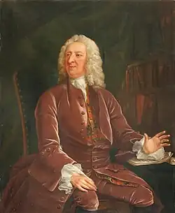 King died on 30 December 1763, and was buried on 5 January 1764 at Ealing, Middlesex. where he had resided for many years on an estate called Newby, near the church. He was also lessee of the rectory of Ealing. Throughout his life he was a water-drinker. His heart, having been enclosed in a silver urn, was deposited by his own directions in the chapel of St Mary Hall, where there is a monument to his memory, with a Latin epitaph written by himself.[2]