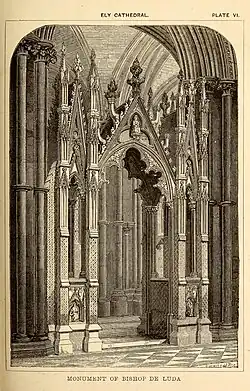 William was elected to the see of Ely on 12 May 1290 and consecrated on 1 October 1290. He died on 25 March 1298 or 27 March.[1][6] He was buried in Ely Cathedral. His only known relative was a nephew William Tuchet, who was his heir.[2] His tomb, with an elaborate canopy, still is located close to where it was originally placed near the high altar in the south choir aisle near the entrance to the Lady Chapel of Ely Cathedral.[7]