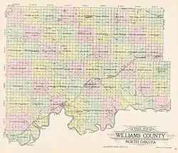 The second Williams County was created by the North Dakota legislature on March 2, 1891, from the previous counties of Buford and Flannery, which were dissolved. The government of this county was organized on December 8, 1891. This county's boundaries were altered in 1910, when a portion of its territory was annexed to create Divide County. Its boundaries have remained unchanged since then.[4] The county is named for Erastus Appleman Williams, a European-American settler who served in the Dakota Territory legislature and the North Dakota legislature.[5]