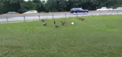 Canada Geese and a Pekin Domestic Duck feeding by the highway at Willson's Woods Park.