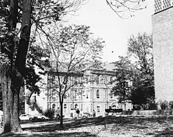In 1863 three brothers, Hugh, James, and Thomas Garvin founded Franklin College in Albany, Ohio. After two years in Albany, the college was relocated to Wilmington, where the cornerstone of College Hall was laid on 4 July 1866. The institution was closed in 1868 following the Civil War. In 1870 the half-completed Franklin College building went up for auction. The building and 33 surrounding acres were purchased by the Religious Society of Friends (Quakers). Lewis Estes was named the first president. Following a few years of economic struggle, Estes resigned. Benjamin Trueblood, a recent Earlham College graduate, was named the new president. In 1875, Wilmington College graduated its first class of four students. South Hall (razed 1956) was the college's first dorm in 1876, and in 1904 the college purchased a former boarding house and named it Twin Ash Hall (demolished 1984).