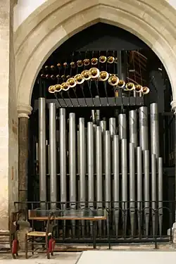 The organ was originally built in 1664 by Robert Hayward, of Bath. There are a number of ranks of pipes, still functioning in the present instrument, which date from this time. Originally, the organ stood upon a screen which separated the nave from the choir. However, in 1856 the organist at that time (Mr. F. Blount) removed the instrument and resited it in the south choir aisle. J. W. Walker & Sons rebuilt and enlarged the organ in 1866 and carried out further work in 1899, when a new case to house the Choir Organ was provided. This was designed by Walter J. Fletcher. In 1965, a major rebuilding and re-designing of the instrument took place, the work again being undertaken by J. W. Walker & Sons. The organ started being rebuilt by Mander Organ Builders in 2021 with a possible completion date of early 2022.[7] The project will see the instrument reorganised, with two new cases, a revised winding system and a new 32' pedal Sub Bass.