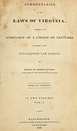 Title page of Volume 1 of Henry St. George Tucker's "Commentaries on the Laws of Virginia". This work includes lectures he delivered while operating the Winchester Law School.