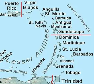 Map showing the Lesser Antilles; Windward Islands (in the southeast) demarcated by red lines.