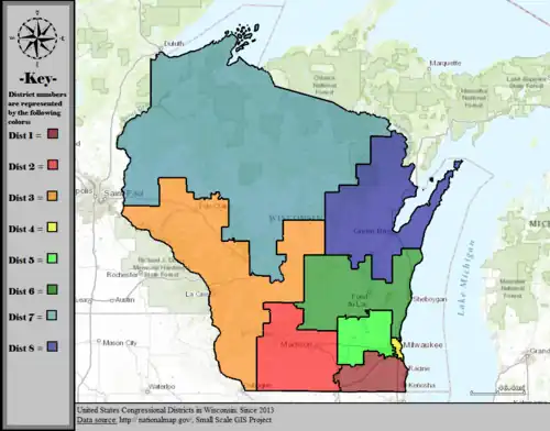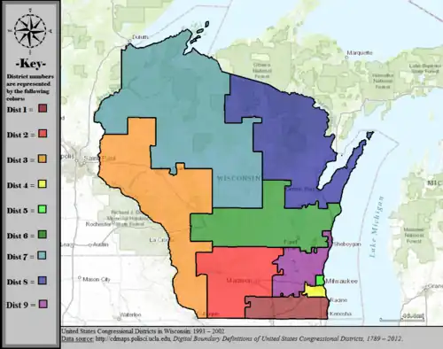 Table of United States congressional district boundary maps in the State of Wisconsin, presented chronologically.[6] All redistricting events that took place in Wisconsin between 1973 and 2013 are shown.