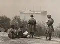 In 1917, British artist Norman Wilkinson submitted a proposal to the Royal Navy to paint optical illusions of geometric shapes, known as dazzle camouflage, to disguise ships. His designs were created in his London studio by 5 designers and painted by a crew of 11 women artists, known as camoufleurs. Between the spring of 1917 and November 1918, the women had painted more than 2,300 vessels.[1] Thousands of women in France were employed as camoufleurs painting guns for the British army by 1917,[2] while others worked with the American forces, making nets to hide artillery and garlands to string through trees and uniforms. For the nets and garlands, brown and green burlap, dyed to match the foliage, was sewn by the women into wire and fishnet tenting to drape over or in front of machinery. The uniforms covered soldiers from head to foot in a burlap suit embellished with raffia palm fronds. The French women also used dazzle camouflage to disguise buildings at the American camp.[3]