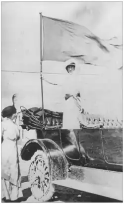 At the Montana State Fair in September, suffragists sponsored a women's suffrage booth.[48][46] At the booth, they gave out copies of the Suffrage Daily News.[48] Children attending the fair were given hat bands that read "I want my mother to vote."[40] After the fair, a large parade was held in Helena.[49][48] Cars were decorated with suffrage colors and delegates represented different areas of Montana.[49] Anna Howard Shaw and Rankin lead the parade.[48] The Boy Scouts and the Anaconda band also marched in the parade.[50] Hundreds of women marched wearing yellow outfits and thousands of spectators came to view the parade which stretched out over a mile.[51][52]