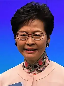 Carrie Lam, Hong Kong's first female Chief Executive, began her career as a civil servant in 1980, and developed a reputation of being a "good fighter" for not backing down in bureaucratic fights.[26][27] In 2007, she entered the cabinet as the Secretary for Development.[27] She then took up the position of Chief Secretary of Administration in 2012.[28] In 2017, she was elected Chief Executive by the 1194-member election committee.[27] Throughout her career she presented herself as an administrator rather than a politician, and early in her tenure, a unifying figure.[29] However, her tenure was marred by protests between 2019 and 2020 in opposition to the proposed bill that allowed for extraditions between Hong Kong and China, which critics feared would erode Hong Kong's separate judicial system.[30] Lam ultimately withdrew the bill, but the protestors and pro-democracy lawmakers also demanded her resignation.[26] She did not seek a second term in 2022.[27]