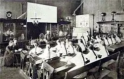 To achieve this increase of women in the workforce, the new communist government issued the first Family Code in October 1918.[31] This code separated marriage from the church, allowed a couple to choose a surname, gave illegitimate children the same rights as legitimate children, gave rights to maternal entitlements, health and safety protections at work, and provided women with the right to a divorce on extended grounds.[32] In 1920 the Soviet government legalized abortion. In 1922 marital rape was made illegal in the Soviet Union.[33] Labor laws also assisted women. Women were given equal rights in regard to insurance in case of illness, eight-week paid maternity-leave, and a minimum wage standard that was set for both men and women. Both sexes were also afforded paid holiday-leave.[34] The Soviet government enacted these measures in order to produce a quality labor-force from both of the sexes. While the reality was that not all women were granted these rights, they established a pivot from the traditional systems of the Russian imperialist past.[34]