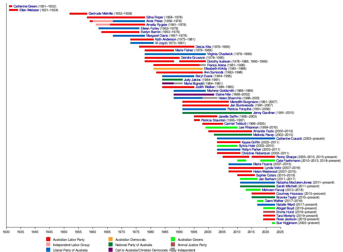 Sue HigginsonRose Jackson (politician)Tara MoriartyEmma HurstAbigail BoydNatalie Ward (politician)Dawn WalkerBronnie TaylorCourtney HoussosMehreen FaruqiSarah MitchellNatasha Maclaren-JonesJan BarhamCate FaehrmannSophie CotsisHelen WestwoodLynda VoltzMarie FicarraPenny SharpeChristine RobertsonRobyn ParkerSylvia HaleKayee GriffinCatherine Cusack (politician)Melinda PaveyAmanda FazioLee RhiannonCarmel TebbuttPatricia StauntonJanelle SaffinJenny GardinerPatricia ForsytheJan BurnswoodsMeredith BurgmannHelen Sham-HoElaine NileMarlene GoldsmithJudith WalkerMarie BignoldJudy JakinsBeryl EvansAnn SymondsElisabeth KirkbyFranca ArenaDorothy IsaksenDeirdre GrusovinVirginia ChadwickMarie FisherDelcia KiteVi LloydKath AndersonMargaret Davis (politician)Evelyn BarronEileen FurleyAmelia RygateAnne PressEdna RoperGertrude MelvilleEllen WebsterCatherine Green (Australian politician)