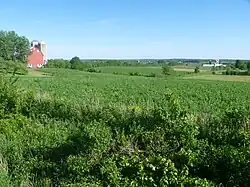 Wood County spans two of Wisconsin's five geographical regions. The northern part of the county is in the Northern Highlands, with mostly rich cropland with heavy clay soil, used for corn, soybeans, hay and dairy.[6] In the northwest corner the Marshfield moraine runs from Marathon County through Marshfield, Bakerville and Nasonville into Clark County.[7] The south and central areas from Babcock through Cranmoor and Wisconsin Rapids are in the Central Plain, flat and marshy - one of the major cranberry-producing centers of the United States.[6] The Wisconsin River cuts across the southeast corner, a corridor of sand flats, islands and oxbows. The river falls about 120 feet as it flows through the county,[8][9] driving several power dams. The remainder of the county is drained by smaller streams and rivers, punctuated by isolated hills like Powers Bluff.