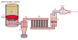 A wood gasifier takes wood chips, sawdust, charcoal, coal, rubber or similar materials as fuel and burns these incompletely in a fire box, producing wood gas, solid ash and soot, the latter of which have to be removed periodically from the gasifier. The wood gas can then be filtered for tars and soot/ash particles, cooled and directed to an engine or fuel cell.[6] Most of these engines have strict purity requirements of the wood gas, so the gas often has to pass through extensive gas cleaning in order to remove or convert, i.e., "crack", tars and particles. The removal of tar is often accomplished by using a water scrubber. Running wood gas in an unmodified gasoline-burning internal combustion engine may lead to problematic accumulation of unburned compounds.