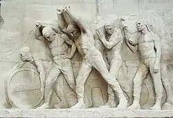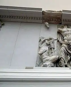 The description of the Pergamon Altar and the gigantomachy it depicts forms the introduction to the novel. The protagonists question the viewpoint of the observer: they see the victorious gods as symbols of the rulers who had the monumental work of art created by exploited people, war is stylised into a myth.[2] They themselves identify with the defeated children of the Gaia and discuss the role of Heracles.[3] This is followed by reflections on the significance of the Pergamon Altar in the history of Pergamon, the excavation of the altar and the transfer of the art treasures to Germany.[4] One conclusion of the first-person narrator is