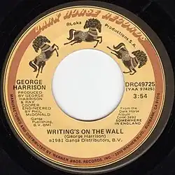 "Writing's on the Wall" is a song by English musician George Harrison from his 1981 album Somewhere in England. It was also the B-side of the album's lead single, "All Those Years Ago", which Harrison wrote as a tribute to his former Beatles bandmate John Lennon. In his lyrics, Harrison sings of the transient nature of life and the importance of recognising a spiritual purpose. Although the song was written long before Lennon's murder in New York in December 1980, the lyrics' reference to how easily friends can be shot down and killed led listeners to interpret it as a further comment on Lennon's death.