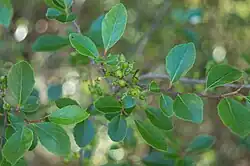 A photo by Facundo Chieffo of Xylosma tweediana displaying its leaves and immature fruits.