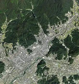 Yamaguchi City is located almost in the center of Yamaguchi Prefecture. The city area, which is the largest in the prefecture, is long from north to south, facing the Seto Inland Sea (Yamaguchi Bay) at the south end, and bordering Shimane Prefecture at the north end. The Fushino River runs through the center of the Yamaguchi Basin from north to south, and urban areas are formed on both sides of the river.