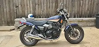 The YX600 Radian is a sport/touring motorcycle manufactured by the Yamaha Motor Company between the years of 1986–1990. Except for the suspension, the rest of the Radian was a parts-bin motorcycle and came equipped with a slightly detuned for mid and low-end torque version of air-cooled, inline-4 which came from the Yamaha XJ600 that was also along with the Radian used in the Yamaha FZ-600 Sport Motorcycle (precursor of Yamaha's FZR series of performance bikes), as well as smaller carburetors and frame from the 550 Maxim.[1][2] Cycle World obtained for the Radian a 1/4 mi. time of 12.76 @ 103.8 mph (167.0 km/h) and 0 to 60 mph (0 to 97 km/h) acceleration at 3.8 seconds.