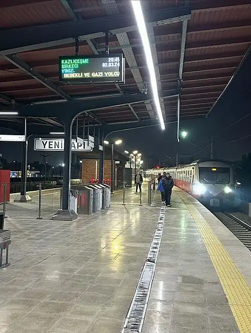 Yenikapı was an indefinitely closed railway station on the İstanbul-Halkalı Line in the Yenikapı neighborhood of Istanbul, Turkey. The station was built in 1872 by the Oriental Railway which was then taken over by the Turkish State Railways in 1937 and electrified in 1955. The station is situated near the south end of the busy Gazi Mustafa Kemal Paşa Boulevard and one block north of Kennedy St, two major inner-city roadways and is 4.8 km (3.0 mi) west of Sirkeci Terminal. Due to the rehabilitation of the line between Halkalı and Kazlıçeşme for future Marmaray commuter service, Yenikapı was indefinitely closed on 19 March 2013. On 29 October 2013, the new underground Yenikapı railway station, which makes up a part of the new Yenikapı Transfer Center, was opened along with the trans-Bosphorus Marmaray tunnel. The new Yenikapı complex is located right next to the existing railway station and is serviced by 3 lines of the Istanbul Metro. The station was rebuilt and reopened on 26 February 2024 as part of the Line T6 T6 Sirkeci–Kazlıçeşme Tramway Line / U3 Sirkeci–Kazlıçeşme Rail Line.[3]