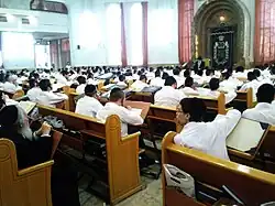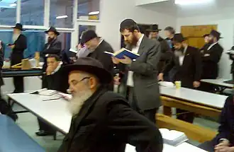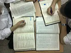Yeshiva students prepare for and review the shiur (lecture) with their chavruta during a study session known as a seder.[1] In contrast to conventional classroom learning, in which a teacher lectures to the student, chavruta-style learning requires the student to analyze and explain the material, point out the errors in their partner's reasoning, and question and sharpen each other's ideas, often arriving at entirely new insights of the meaning of the text.[32] A chavruta is intended to help a student keep their mind focused on the learning, sharpen their reasoning powers, develop their thoughts into words, organize their thoughts into logical arguments, and understand another person's viewpoint.[33] The shiur-based system was innovated at the Telshe yeshiva, where there were five levels.