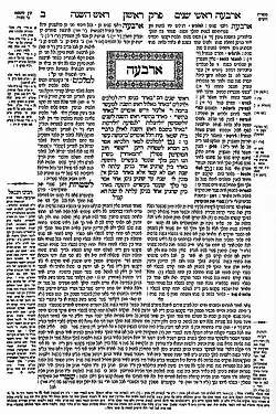 The first page of tractate Rosh Hashanah in the Babylonian Talmud. The center column contains the Talmud text, starting with a section of Mishnah. The Gemara begins on the eighth line, indicated by גמ׳. The large blocks of text on either side are the Tosafot and Rashi commentaries. Other notes and cross references are in the margins. The "standard" commentaries[42] - Rosh, Rif, Mordechai, Maharam, Maharsha, Maharshal - are appended to the tractate, while other major commentators are published separately.