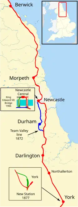 Although the Great North of England Railway had authority for a railway from York to Newcastle, by 1841 it had spent all of the £1,330,000 of capital that had been authorised to build the line to Darlington and could not start work on the extension to Newcastle. At the time Parliament was considering the route of a railway between England and Scotland and favouring a railway via the west coast. Railway financier George Hudson chaired a meeting of representatives of north-eastern railways who wished such a railway to be built via the east coast,[40] and Robert Stephenson was engaged to select a route between Darlington and Newcastle using the existing railways as much as possible. Stephenson's proposed route differed from the GNER route slightly in the southern section before joining the Durham Junction at Rainton and using the Pontop & South Shields from Washington to Brockley Whins, where a new curve onto the Brandling Junction would allow direct access to Gateshead. This required the construction of 25+1⁄2 miles (41.0 km) of new line, 9 miles (14 km) shorter than the GNER route, but trains would need to travel 7+1⁄2 miles (12.1 km) further. However, this bypassed the S&DR, even though the railway ran parallel to the S&DR for 5 miles (8.0 km). Joseph Pease argued that it should run over its lines as this would add only 1+1⁄2 miles (2.4 km) to the route.[41] The bill was presented to Parliament in 1842, it was opposed by the S&DR and the Dean and Chapter of Durham, who were asking for £12,000 for land with the N&DJR offering only £2,400; eventually a jury valued this land at £3,500. Great North of England Railway Act 1842 (5 & 6 Vict. c. lxxxiv) received royal assent on 18 June 1842, but a second act of Parliament the following year, the Great North of England Railway Act 1843 (6 & 7 Vict. c. viii), was necessary to secure the deviations from the GNER route in the south recommended by Stephenson.[39][42]