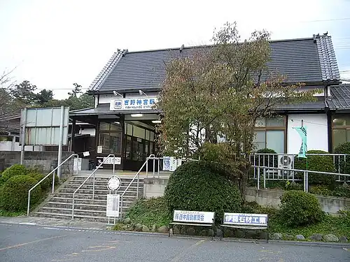 2. ^ "吉野神宮駅" [Yoshino-Jingū Station]. hacchi-no-he.net. Retrieved 16 March 2018.
