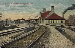 The station was built in 1905 at the cost of $70,000. It was located on the southern banks of the Mahoning River. This was in contrast to competing stations of the Erie, New York Central and Pennsylvania railroads located in the city's downtown. The B&O raised the railroad tracks to the level of the building's second floor after river flooding of the area, which reached an epic level in March 1913.[3] In 1926 the company added a freight house.[4][2]