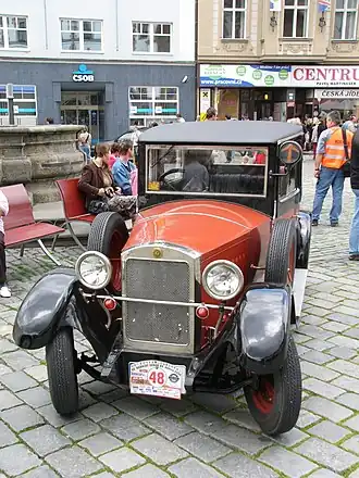 The range of body types available increased over the car's production life. In September 1926, a limousine version was launched at the Prague Motor Show at a price of 40,500 Kčs. This had a fixed roof with four side windows and more equipment, including an electric cigar lighter and coat hanger. A sports roadster was also available, priced at 45,000 Kčs. Gradually over time, two and four door phaetons, landaulets and other custom designs were added to the range.[1] There was also a pickup truck capable of carrying a 500 kg (1,100 lb) payload.[4]