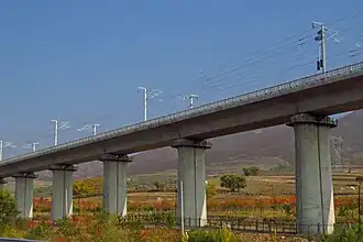 The Zhangjiakou-Hohhot high-speed railway is a high-speed railway located in China. It connects Hohhot, the capital city of Inner Mongolia, to Zhangjiakou in Hebei province. The line has a length of 286 km (178 mi) as a double-tracked passenger dedicated line, with seven stations situated along its route.[1] Construction was commenced on April 28, 2014.[2] Connection with the Beijing–Zhangjiakou intercity railway enables high speed rail services from the central region of Inner Mongolia to Beijing, reducing the travel time between Beijing and Hohhot from nine hours to under three hours.[3] The western section from Ulanqab to Hohhot East was opened on August 3, 2017.[4] The section from Zhangjiakou to Ulanqab opened in December 2019.[5]